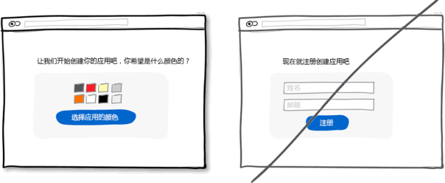 與其讓用戶馬上注冊,何不讓用戶先進行一些體驗式的操作呢。這個體驗過程可以展示程序的功能,特性等。一旦用戶通過簡單幾步的操作了解了程序的價值所在,那么它會更愿意填寫注冊表單的。這種循序漸進的引導可以盡量推遲用戶注冊的時間但又可以讓用戶在沒注冊的情況下進行個性化設置等簡單操作。
