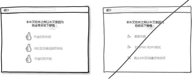 市場就是這樣的,用戶永遠只關心自身利益而產品特性對他們來說倒不是那么重要。只有利益才更直觀地體現出使用產品所帶來的價值。Chris Guillebeau在他的著作《100美元起家》中指出,相比壓力,沖突,煩心事和未知的未來,人們在乎得更多的是愛,金錢,認同感和自由支配的空閑時間。所以我相信在展示產品特性時回歸到利益上是必要的。