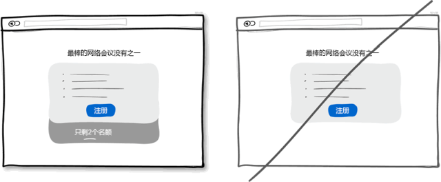 物以稀為貴。饑餓營銷給出的信息就是東西不多,只剩幾件,明天再來,可能沒了。你去比較一下批發與限量版的東西他們的價格差距有多大就知道了?;剡^頭來看,那些批發商或者大零售商,他們也使用饑餓營銷,以獲得更好的銷量。但在軟件行業,我們經常會忘記有饑餓營銷這回事。因為數字產品是可以很容易拷貝復制的,不存在缺貨的情況。其實,在界面設計中,也可以將其運用起來與現實中的資源緊缺進行聯系。想想一次網上研討會的門票,想想你一個月可以服務的人數限制,這些信息都可以告知用戶是有限的。