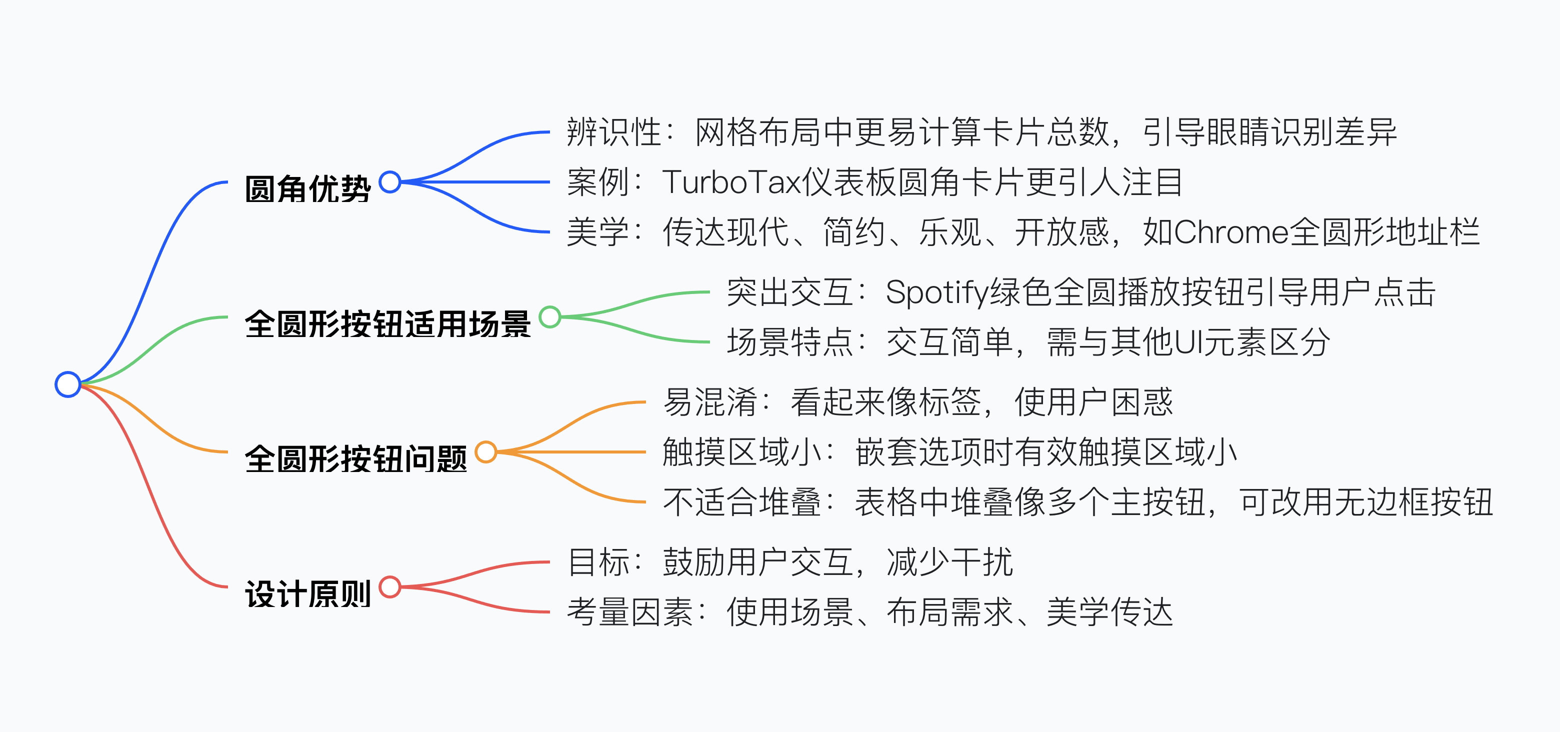 UI 設(shè)計中按鈕用圓角還是直角需綜合考量,圓角在網(wǎng)格布局中更易辨識,如 TurboTax 儀表板中圓角卡片比尖角更引人注目,全圓形按鈕在 Spotify 中因突出交互引導(dǎo)成功,但全圓形按鈕可能被誤認標簽、嵌套選項觸摸區(qū)域小、不適合堆疊,而直角按鈕在表格等堆疊布局中更合適,此外圓角傳達現(xiàn)代、簡約等感覺,像 Chrome 瀏覽器更新為全圓形地址欄,總之設(shè)計需以鼓勵用戶交互、減少干擾為目標,而非單純選擇圓角或直角。