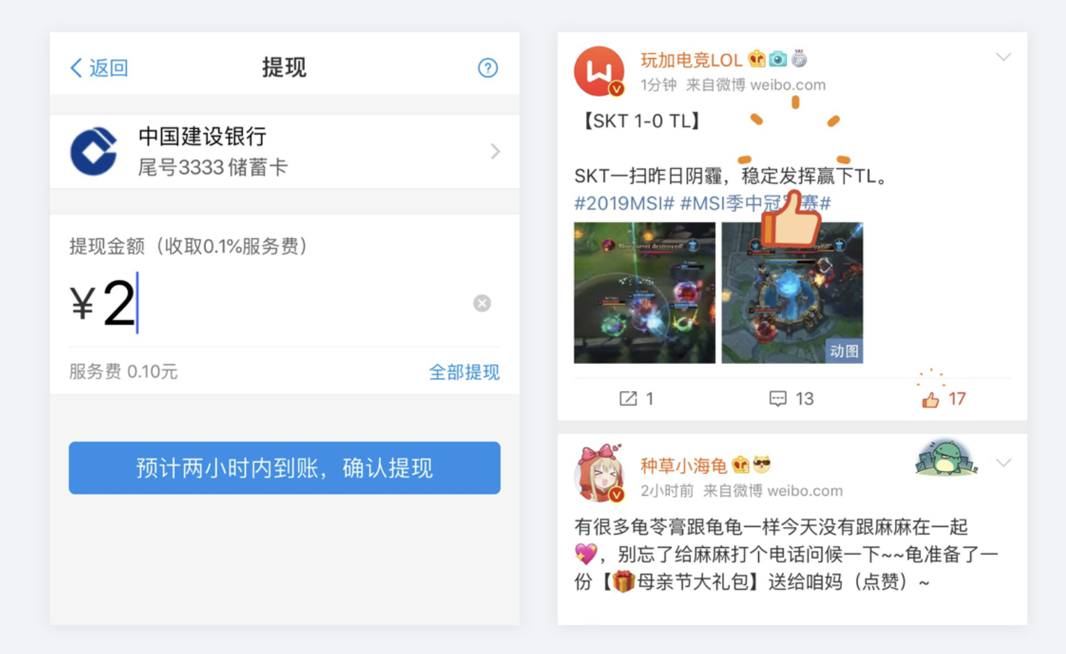 - 符合預(yù)期與超出預(yù)期的設(shè)計:交互設(shè)計遵循操作前可預(yù)知、操作中有反饋、操作后可撤銷原則,符合用戶預(yù)期并增加超出預(yù)期反饋,如支付寶 APP 提現(xiàn)預(yù)先告知到賬時間,微博 APP 點贊彈出點贊圖標小動畫。