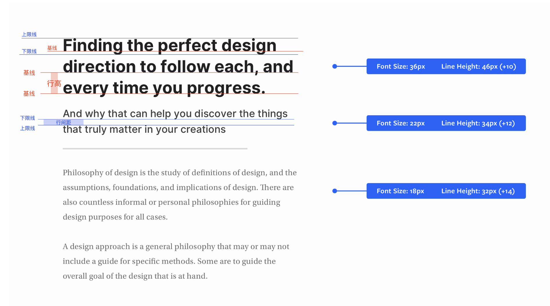 - 搭配字體與行高:字體越小,增大行高可提升可讀性和易讀性。其中,英文的行高是指上一行的基線到下一行基線之間的距離;行間距則是上一行的下限線與下一行的上限線之間的距離,二者需注意區(qū)分。