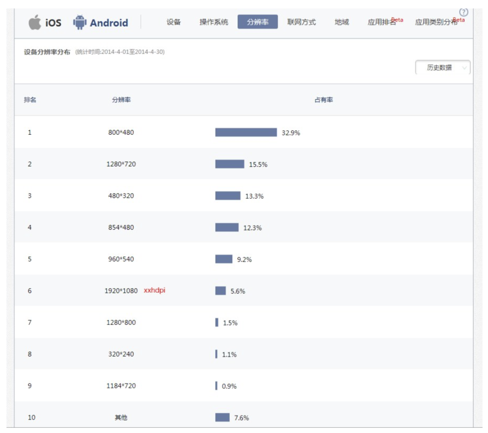 1. 分辨率選擇:綜合考慮適配效率和機型分布,建議從 xhdpi(720*1280)分辨率入手。因大分辨率內容縮小適配性更好,且該分辨率能兼顧安卓的 mdpi、hdpi、xhdpi 及 iPhone 3G、iPhone 4 及以上機型,一定程度上可實現一套界面適配安卓和 iOS(雖兩者交互差異大,不建議完全共用界面)。