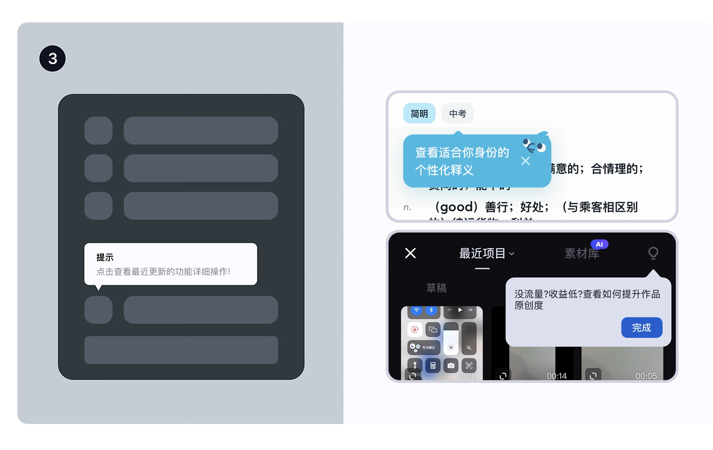 當用戶第一次點擊某個功能(比如新按鈕、新模塊)時,用小氣泡給出簡短說明,不打斷操作流程,很適合功能細節引導。