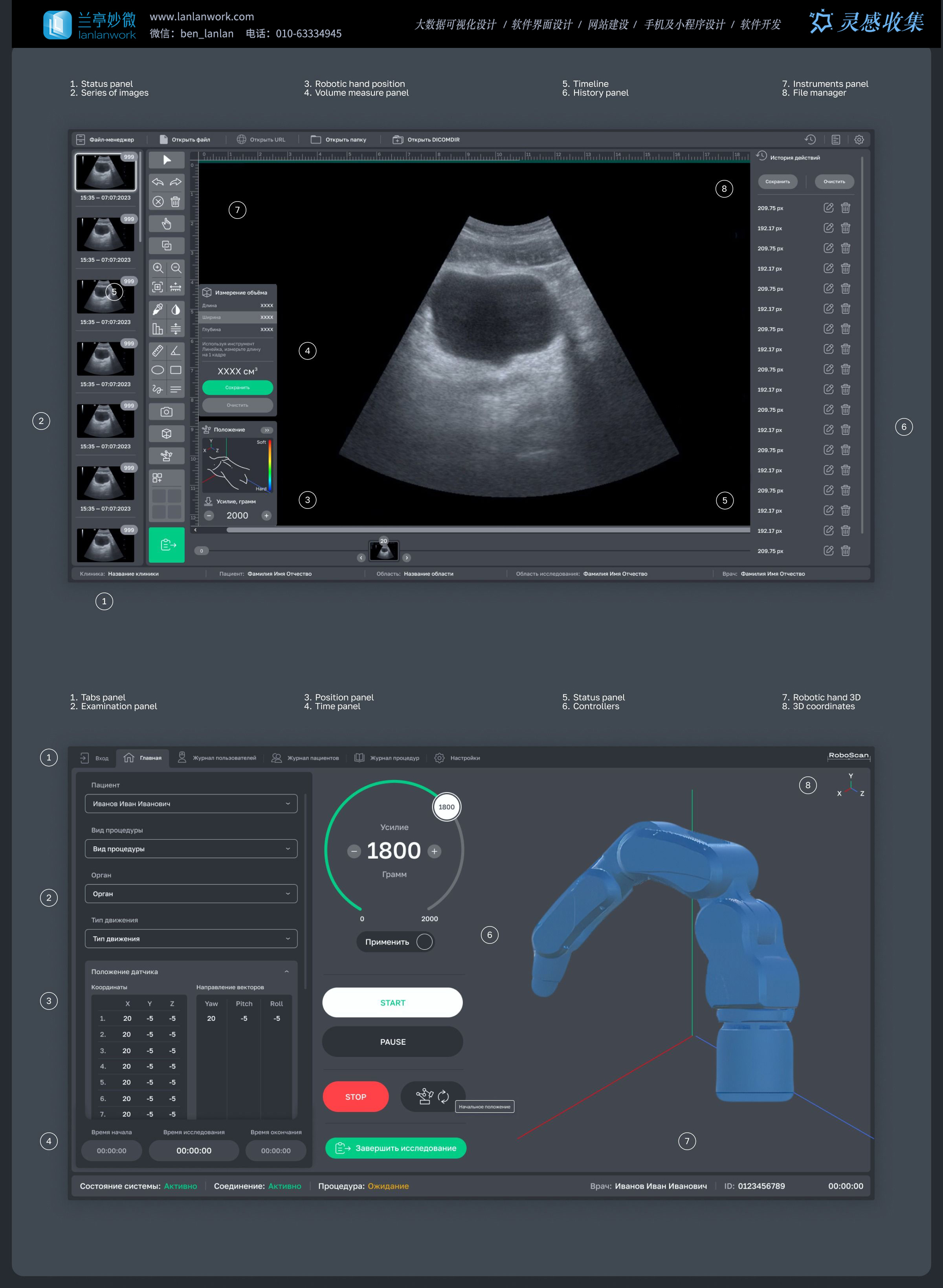 當(dāng)醫(yī)療機(jī)器人界面還停留在 “設(shè)備控制 + 數(shù)據(jù)展示” 的分離邏輯時,蘭亭妙微這套超聲機(jī)器人系統(tǒng)界面,以「影像 - 操作雙維協(xié)同」的設(shè)計思路,重構(gòu)了 “醫(yī)生 - 機(jī)器人 - 患者” 的交互關(guān)系。它不僅是一個操作面板,更是醫(yī)療機(jī)器人領(lǐng)域 “精準(zhǔn)性與易用性平衡” 的標(biāo)桿案例。