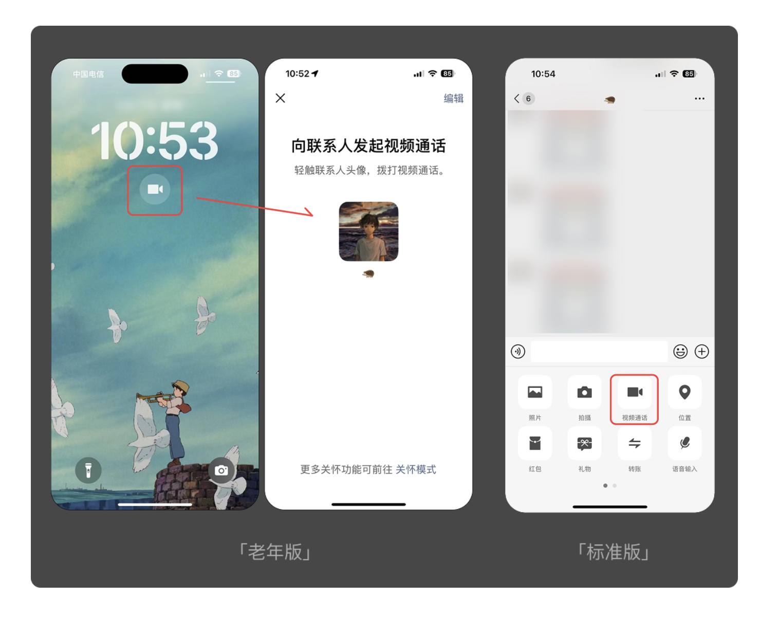 對老年人而言,多余的操作步驟就是無形的門檻。優秀的適老化設計會砍掉非必要功能,讓核心需求一鍵直達。滴滴老年版便是典型案例:標準版需要先輸入目的地再點擊叫車,而老年版直接在首頁設置 “呼叫出租車” 大按鈕,省去輸入環節,讓用戶無需學習就能完成叫車。QQ 老年版同樣簡化了動態查看流程,標準版需兩次點擊才能進入的頁面,老年版一次點擊即可直達,大幅提升操作效率。