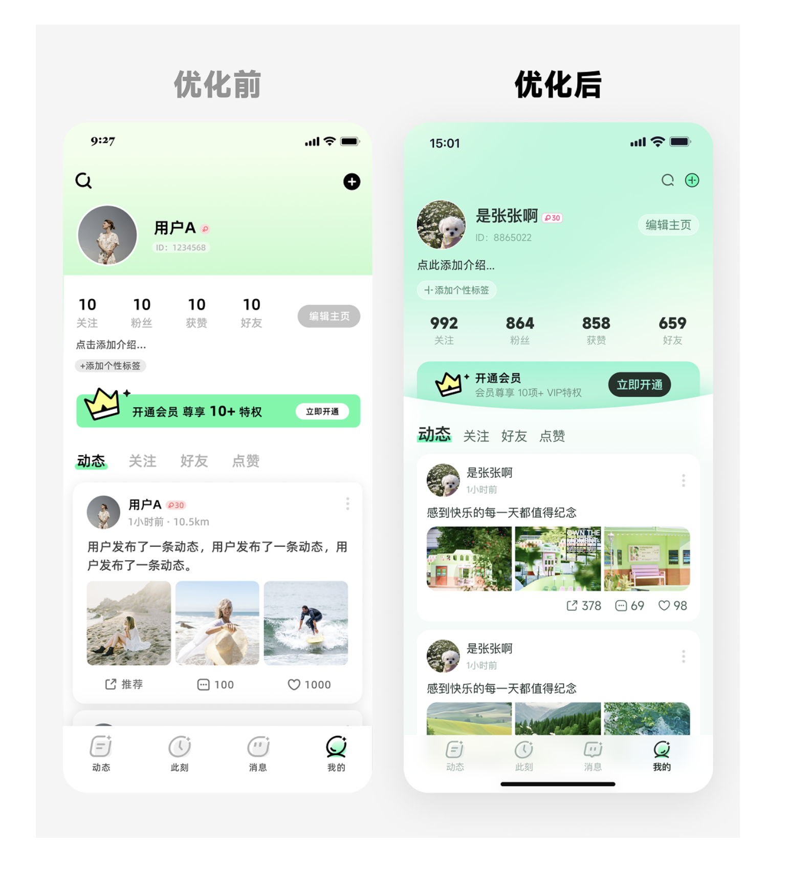優化重點是 “做減法”:刪除與內容無關的干擾元素,聚焦用戶發布的動態本身;用不同背景色區分不同類型的動態卡片,替代厚重的投影,讓頁面更通透;同時優化卡片間距和內邊距,避免視覺擁擠,讓整個動態流更清爽易讀。