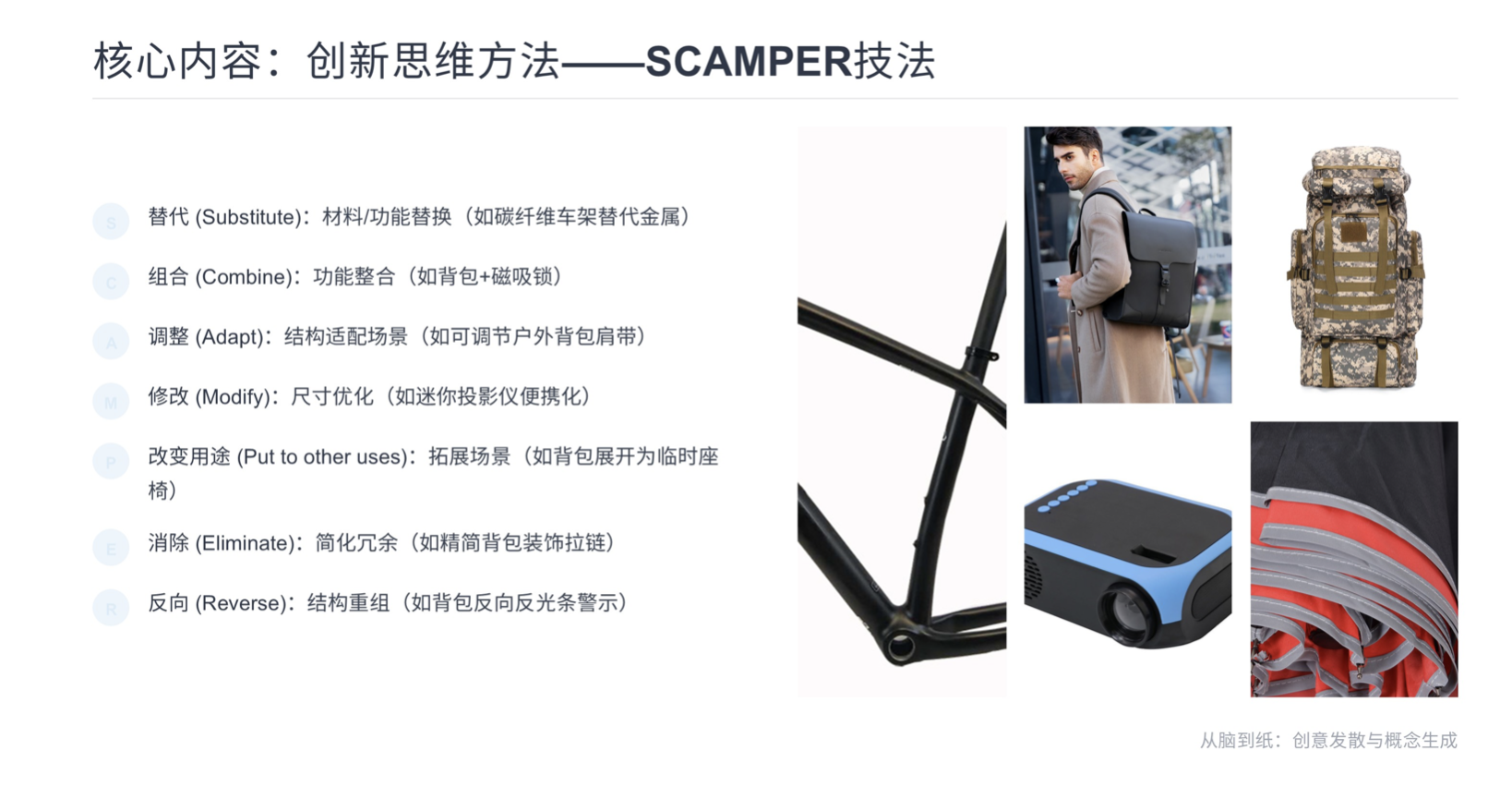 - 反向(Reverse):重組產(chǎn)品結(jié)構(gòu)或功能,如將背包反光條反向設(shè)計,增強夜間出行警示效果。
