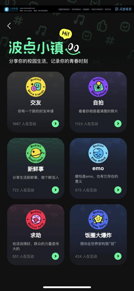 - 界面特點:深色背景 + 高飽和度色塊,視覺對比強烈;手繪風格的圖標和文字,貼合校園用戶的審美偏好,營造輕松有趣的社交氛圍。