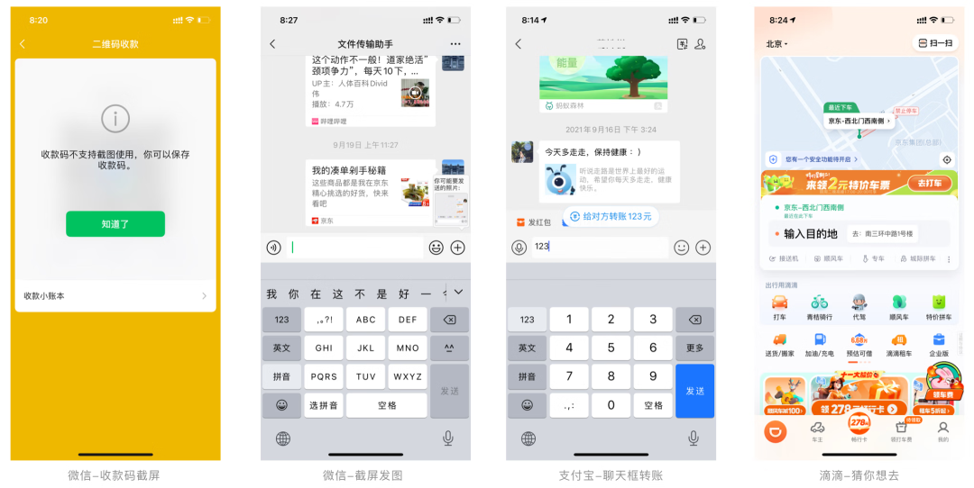 舉例:1)微信在用戶收款碼頁面中,用戶只要進(jìn)行了截屏操作,一般都是想保存二維碼,所以微信在捕捉到用戶的截屏操作后,會自動觸發(fā)保存二維碼彈層;2)用戶剛進(jìn)行截屏操作后,進(jìn)入微信聊天頁點擊「+」,會自動浮現(xiàn)截圖,方便用戶直接發(fā)圖;3)支付寶聊天窗中,輸入了數(shù)字后會自動觸發(fā)轉(zhuǎn)賬的操作;4)滴滴中會記憶用戶過往目的地,并根據(jù)重復(fù)記憶結(jié)果,在用戶下次進(jìn)入時,在目的地輸入框中浮窗展示目的地,簡化了目的地搜索過程,使重復(fù)行為變得更加簡單。