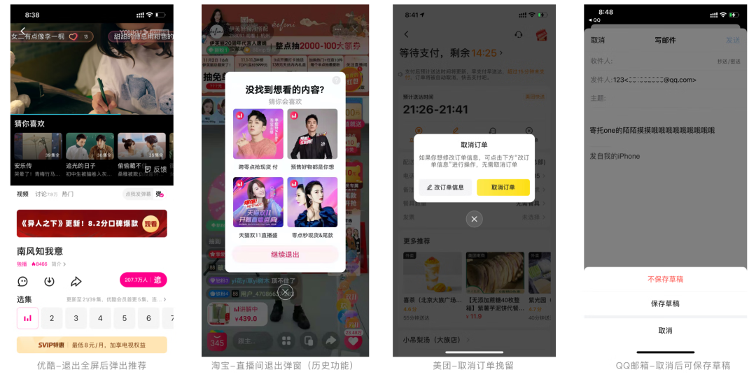 舉例:1)優(yōu)酷視頻中,用戶在觀看視頻中,退出全屏?xí)r會判斷用戶對當(dāng)前視頻興趣減弱,從而在小窗視頻下為用戶推薦其他視頻;2)淘寶中,用戶退出直播間時,系統(tǒng)會判斷用戶對當(dāng)前直播不感興趣,為用戶提供其他直播內(nèi)容推薦;3)美團(tuán)取消訂單時,會為用戶提供修改訂單信息的功能,從而挽留用戶繼續(xù)當(dāng)前訂單;4)QQ郵箱中,用戶在寫郵件時點擊取消時,會為用戶提供保存草稿的操作,方便用戶保存當(dāng)前內(nèi)容。